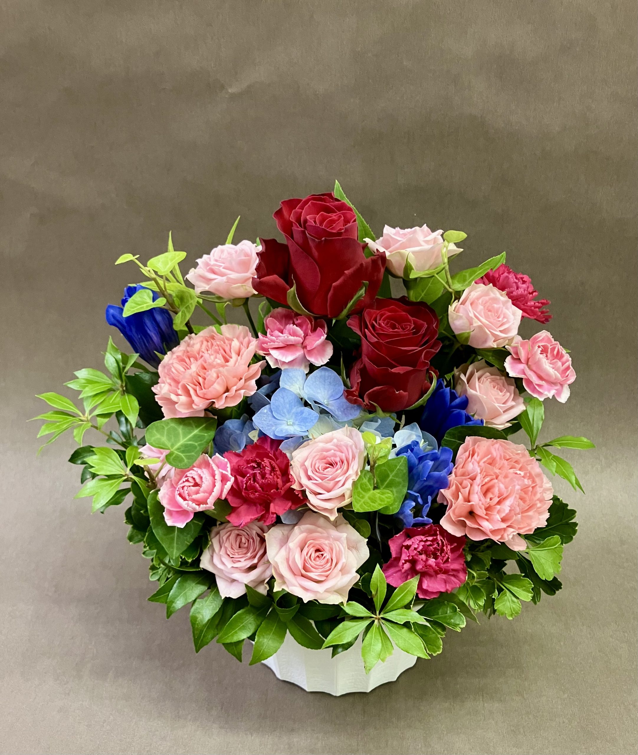 季節のお花、アジサイ、バラ、リンドウなどでお作りしております。葉っぱも少々多めにしてちょっと涼しい感じを出しました。