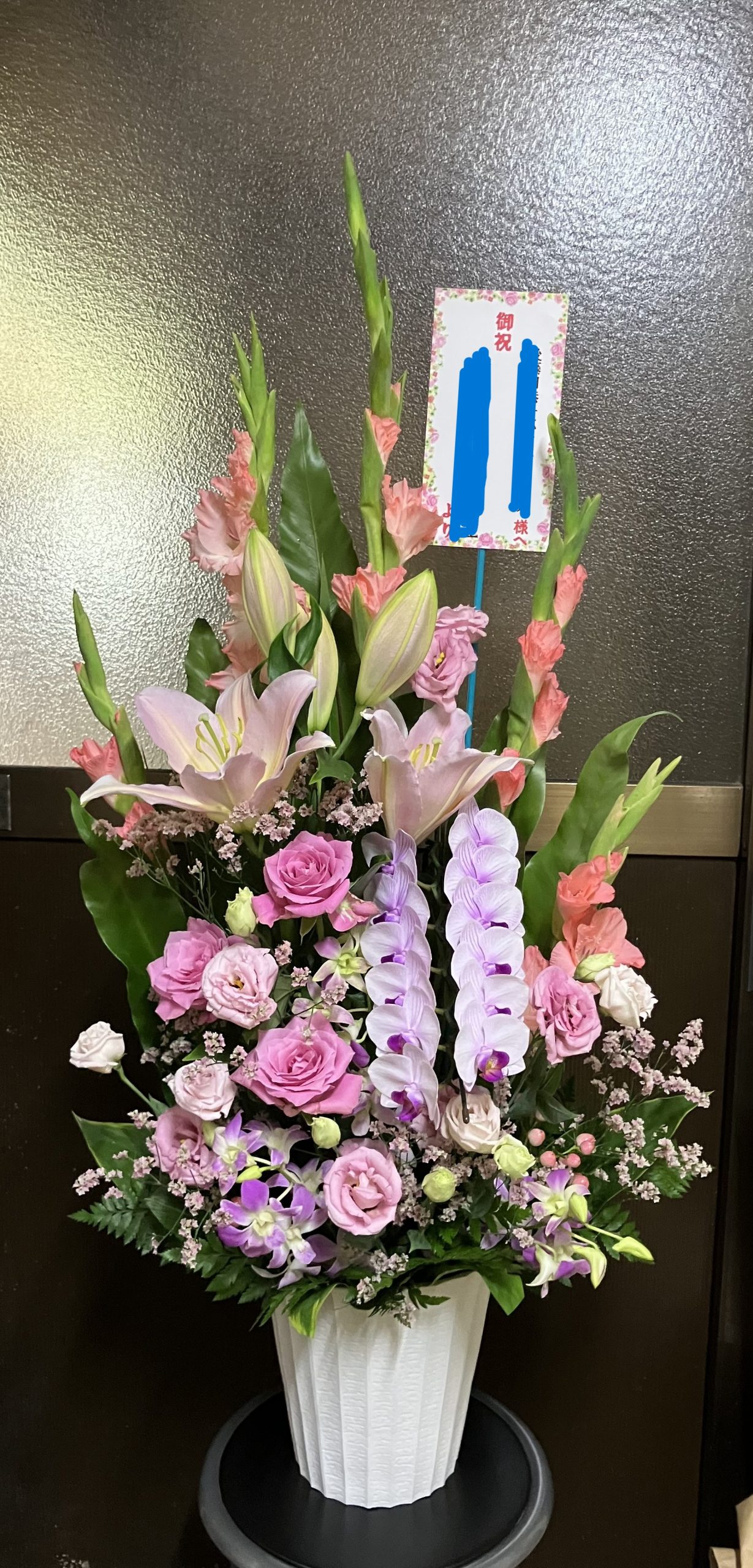犬山市、花の香花園です。バレエの発表会のお祝いアレンジメントです。ピンク系で背を高めにお作りするスタイルを希望されました。犬山市民文化会館へお届けいたしました。おめでとうございます。ご注文ありがとうございました。