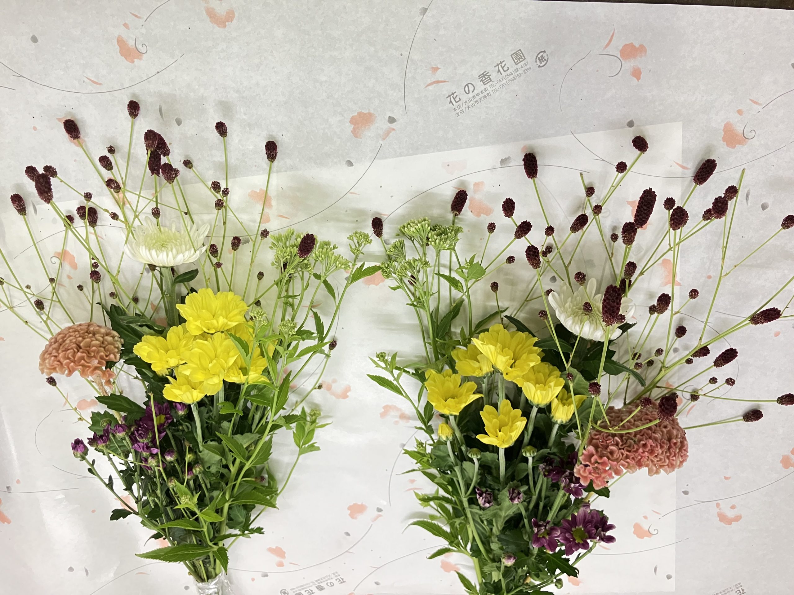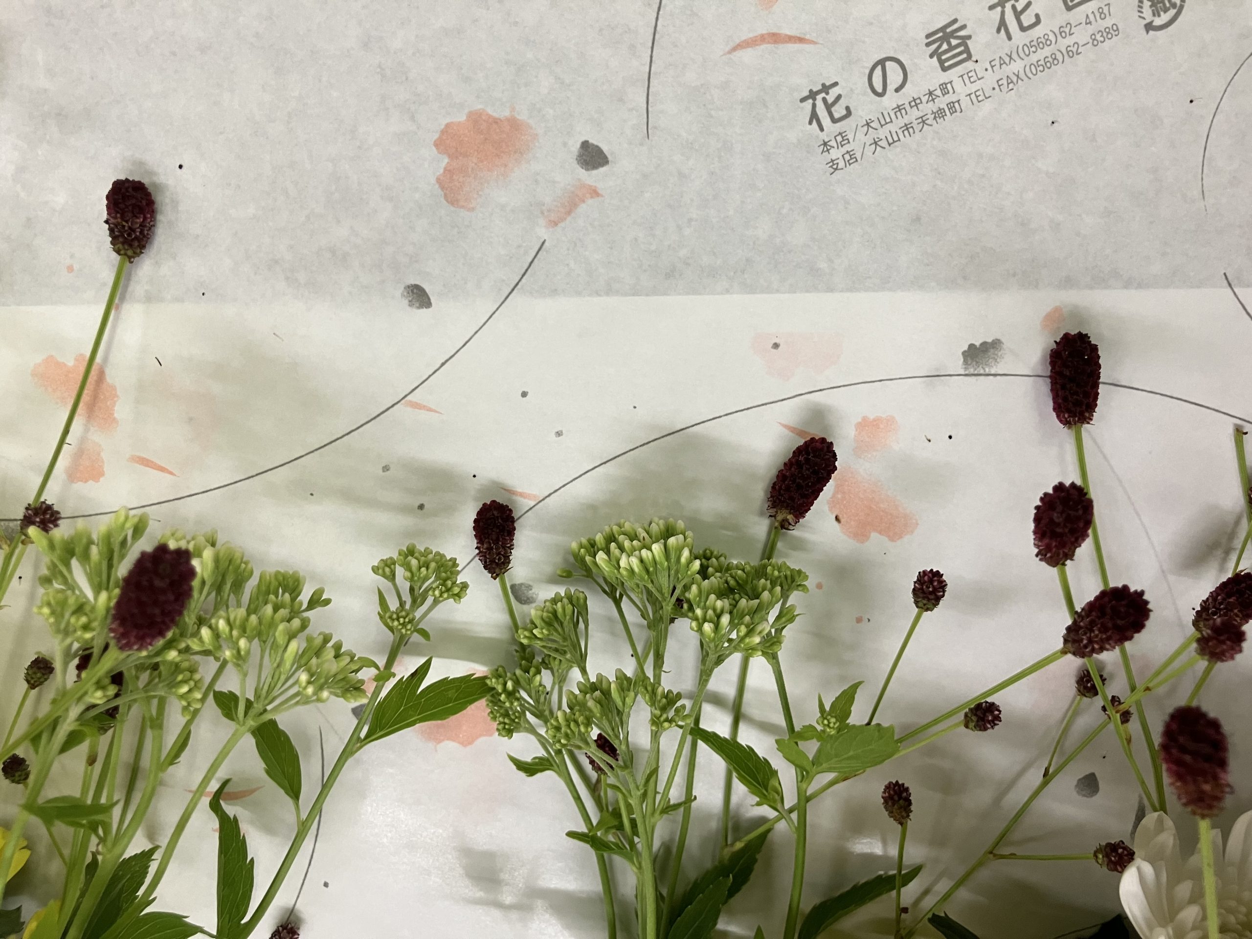 季節のお花、ワレモコウ、フジバカマ(白色)、菊、小菊、ケイトウなどで束ねました。