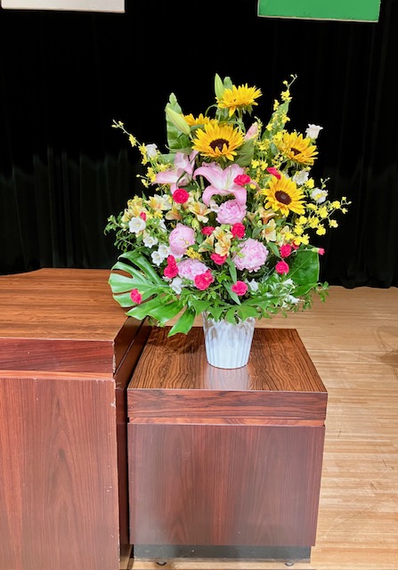 ステージ花や、演台のお花は花の香花園からお届けに伺っております。器は費用に入っている場合がありますのでそのまま、会社やご自宅にお持ち帰りいただきしばらく飾って楽しまれてもよいですよ。