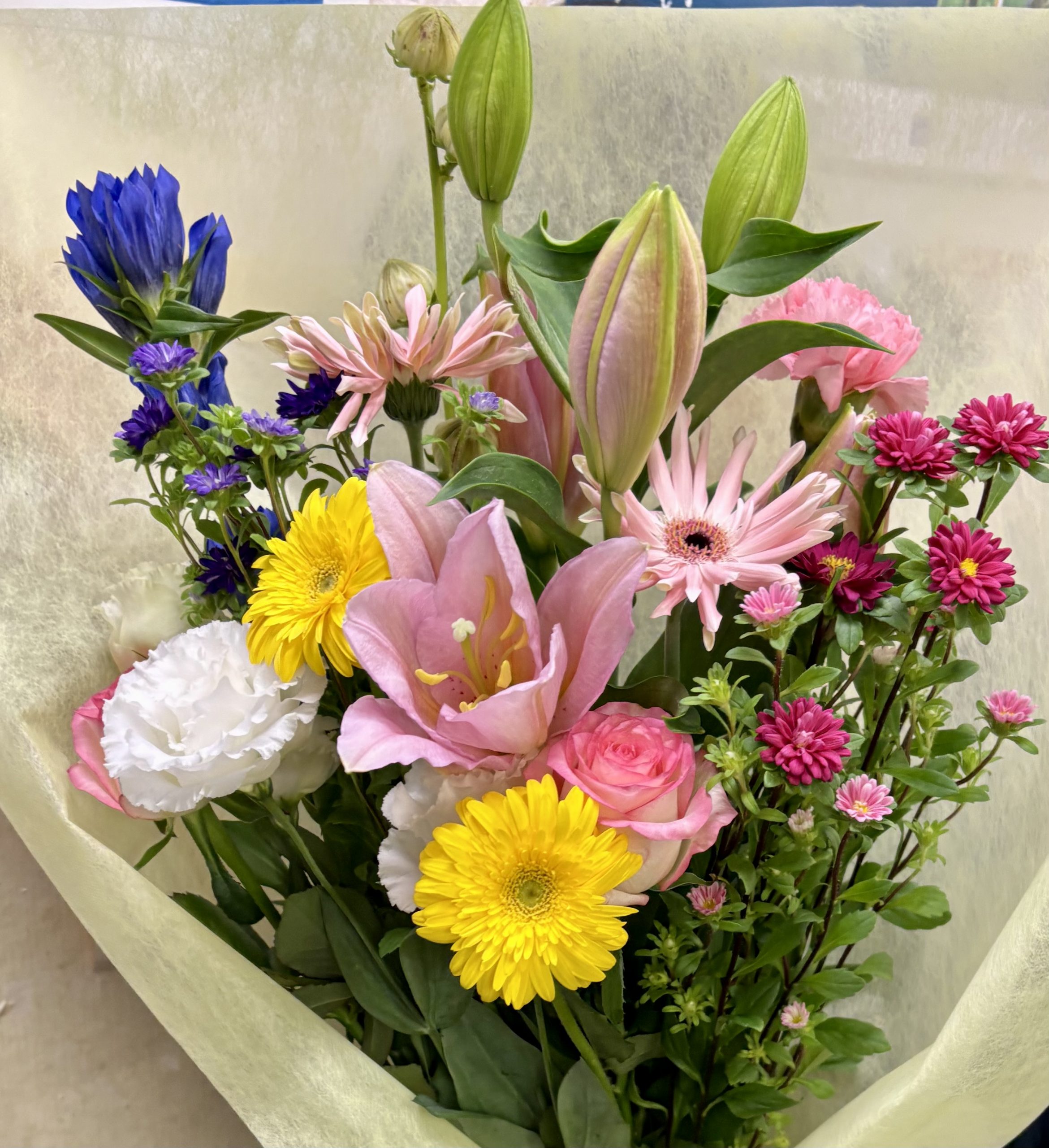 花弁がパスタのようにクルリと筒になっている優しいピンク色のガーベラの「ペサロ」をお入れし、紅アオイ(白色のベニアオイ・アイボリー)、リンドウなど季節のお花もいれつつ、アスター、バラなどで可愛く束ねました。会社さんから従業員さんへ、お誕生日お祝いの花束です。おめでとうございます。ご注文ありがとうございました。