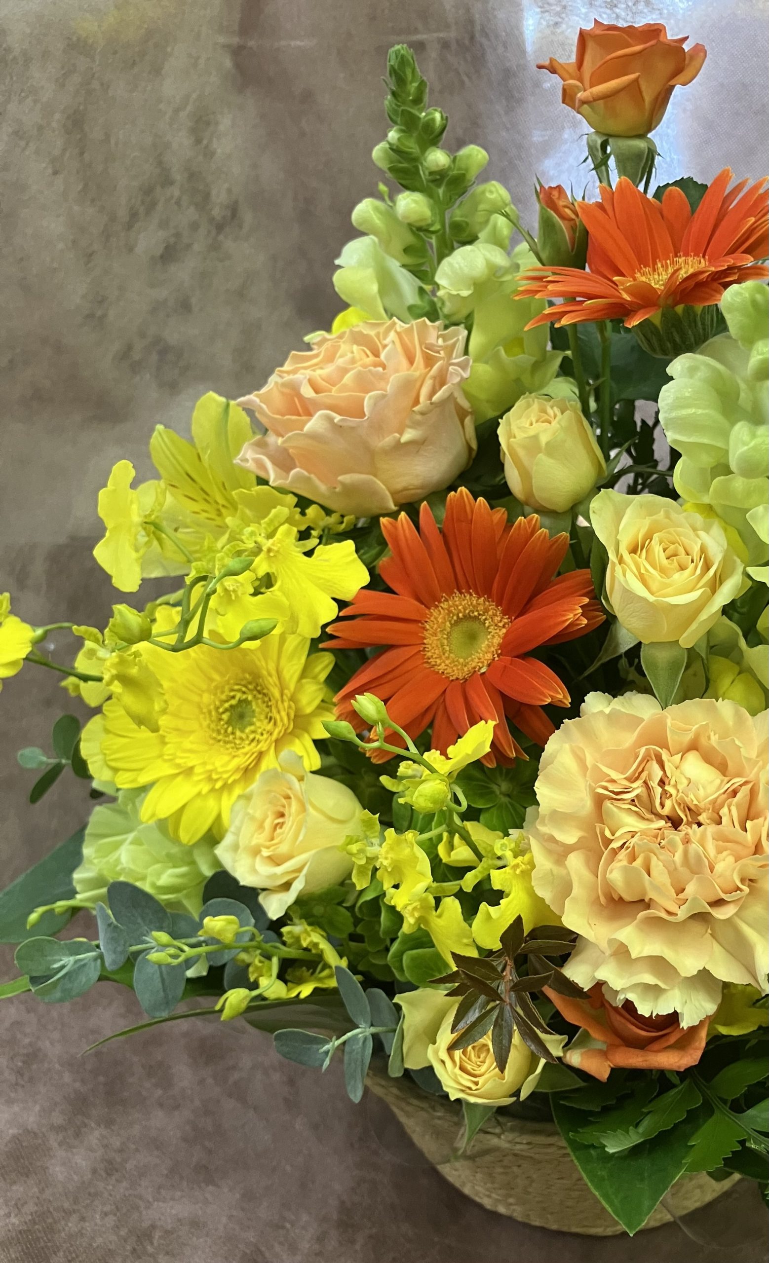 黄色・オレンジ色系のビタミンカラーをご希望でオンシジュウム、オレンジバラ(カルピデューム)、ガーベラ、カーネーションなどでお作りしております。旦那様から奥様への贈り物です。おめでとうございます。ご注文ありがとうございました。