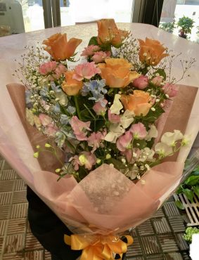 バラをメインに季節のお花もお入れしお作りしました。豪華ですが可愛い雰囲気に仕上がったと思います。オレンジバラ、ピンクスプレーバラ、スイートピー、カスミソウ、デルフィニウムで束ねました。
