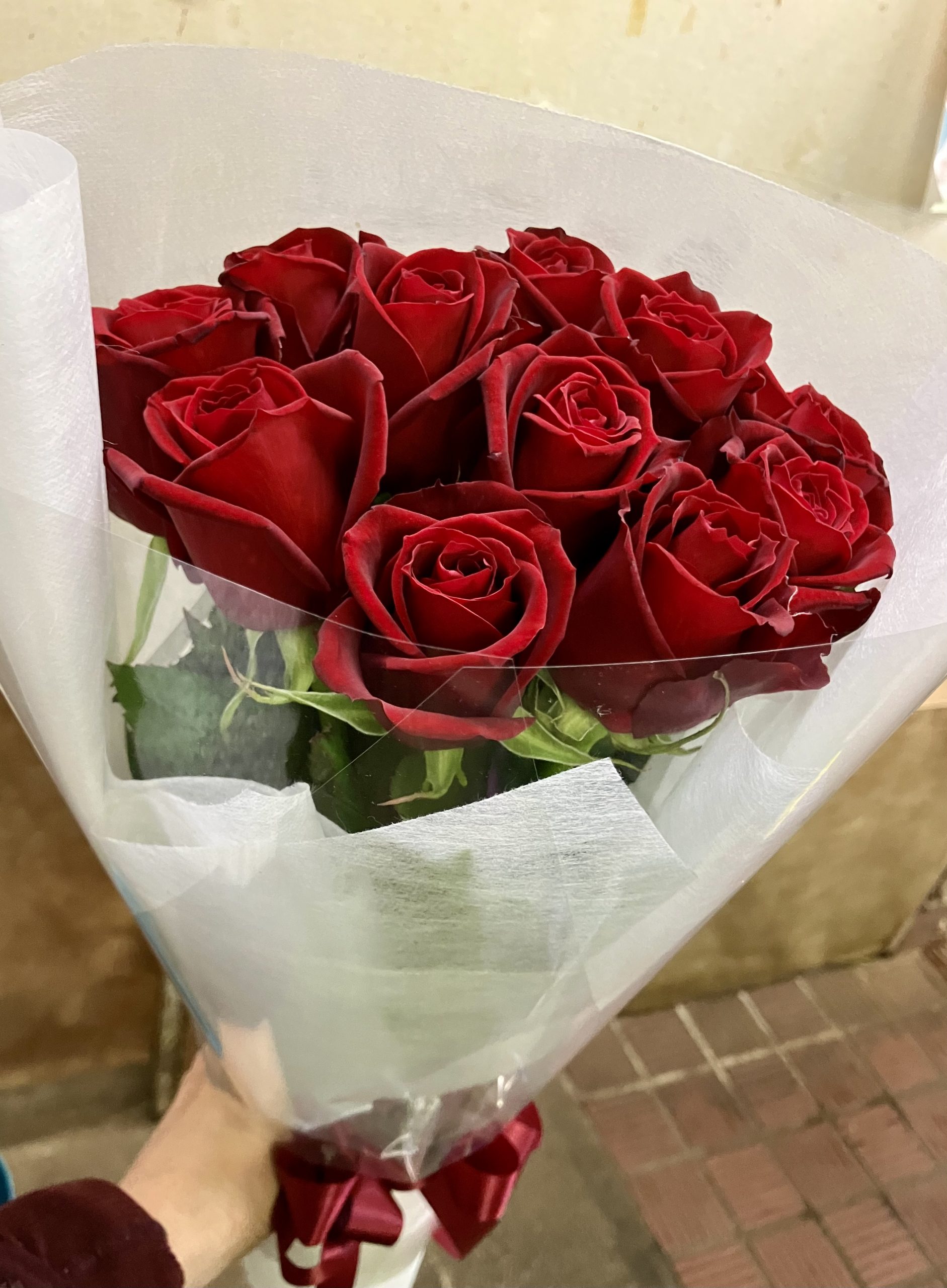 バラの本数を決めてお花をご予約していただいたお客様も増えて参りました。皆さん思い思いの本数を希望され、束ねさせていただきました。今回の方は、11本のバラの花束です。お花の頭を揃えて段違いにせずに束ねた感じです。白色のラッピングペーパーにワインレッドのリボンで結びました。長さは短めご希望でしたので45センチちょっとの長さになっています。素敵な花束です(^_-)-☆