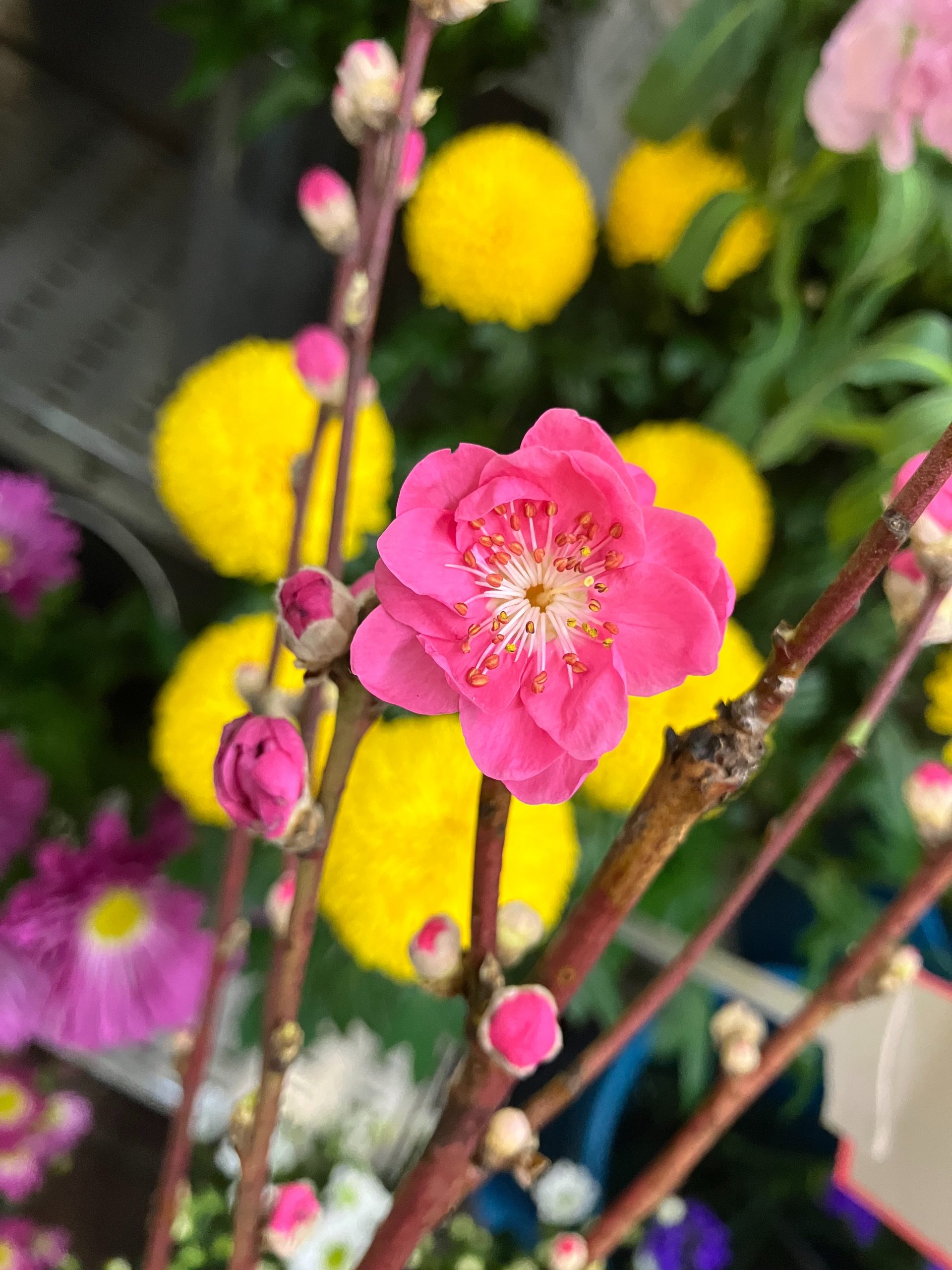 桃の花の添え花として、チューリップや菜の花、キンセンカなど、すくすく伸びる春のお花を合わせて飾ることも多いですね(^^)/