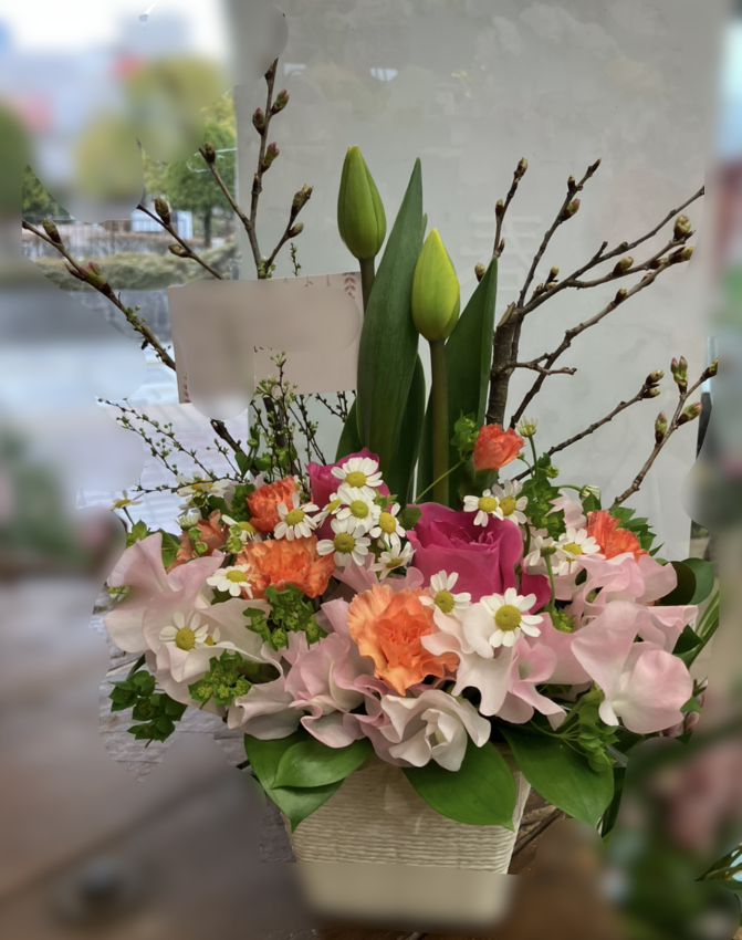 タグ: お祝い, お誕生日祝い, かわいい, しろひがし店, アレンジメント, スイートピー, チューリップ, 中本町, 予約, 家族, 桜, 犬山城下町, 犬山市、花屋, 犬山駅東口, 花の香花園, 配達