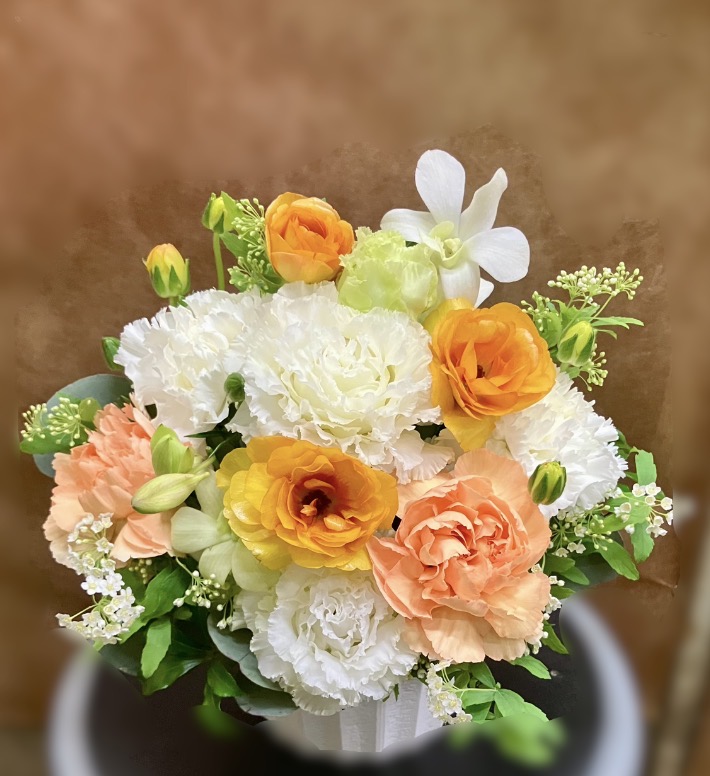 タグ: かわいい, しろひがし店, アレンジメント, 中本町店, 予約, 家族, 御供, 御供っぽくない感じ, 犬山城下町, 犬山市、花屋, 犬山駅東口, 白・オレンジ色, 花の香花園, 花キューピット, 配達