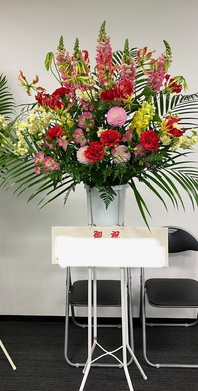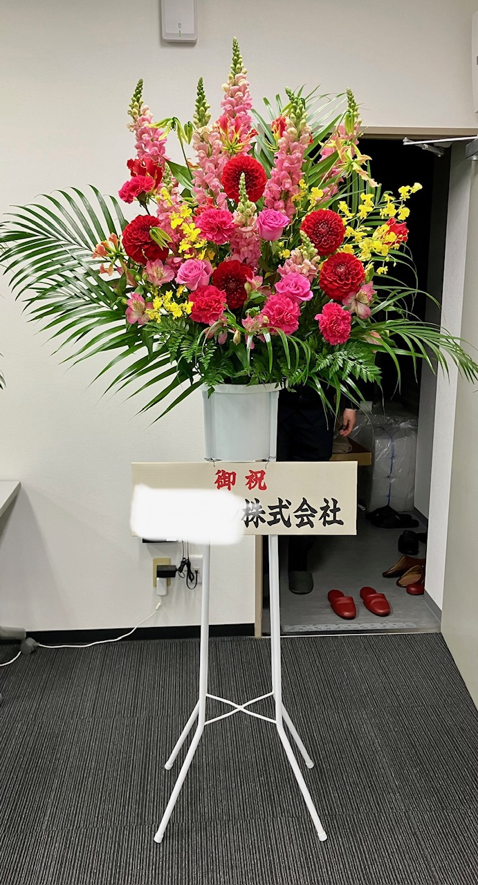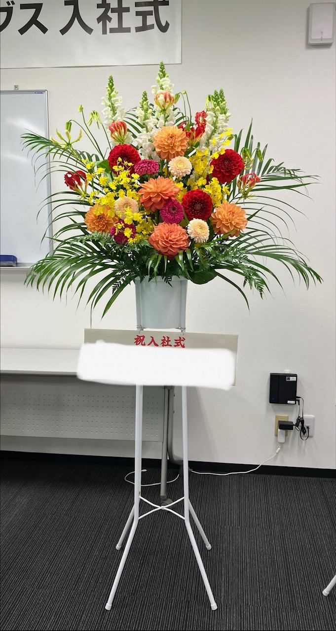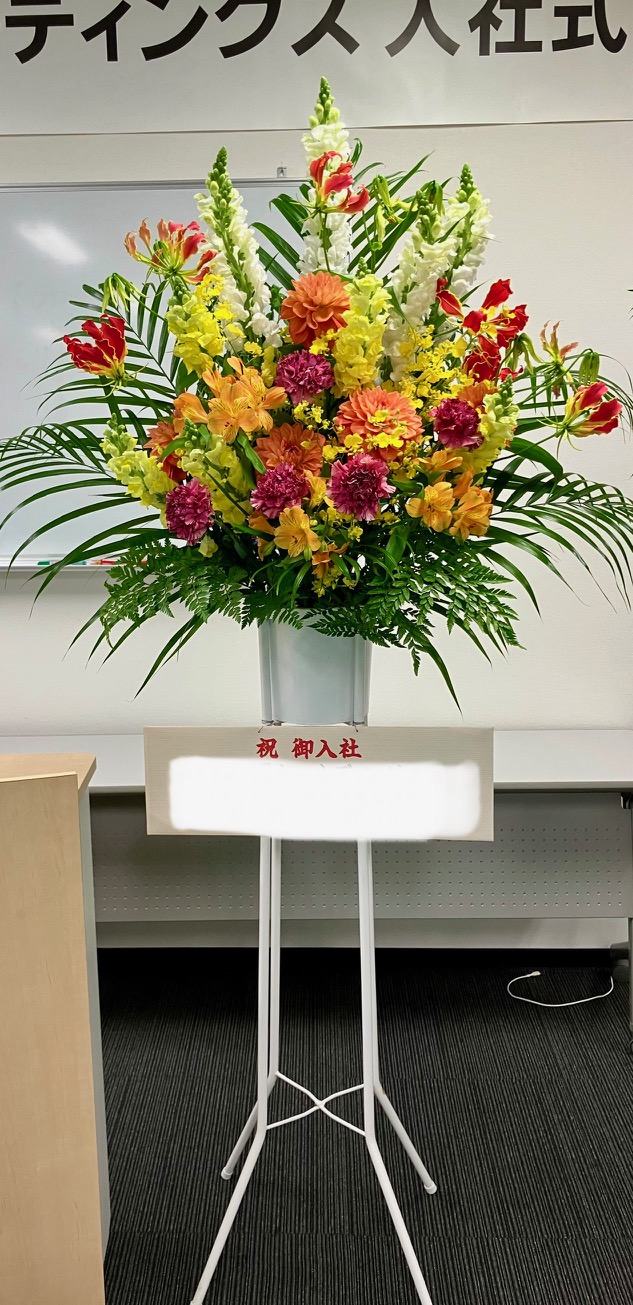 入社式の式典にお祝いスタンド花を飾りました。