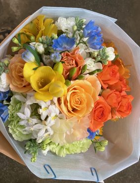演奏会に出演される方へのお祝い花束です。今回は丈を短くブーケ風に束ねたこじんまりとコンパクトで可愛いサイズです。男性(学生)用で白、水色、黄色・オレンジ色、緑色などで花材お任せの可愛い感じにお作りしております。