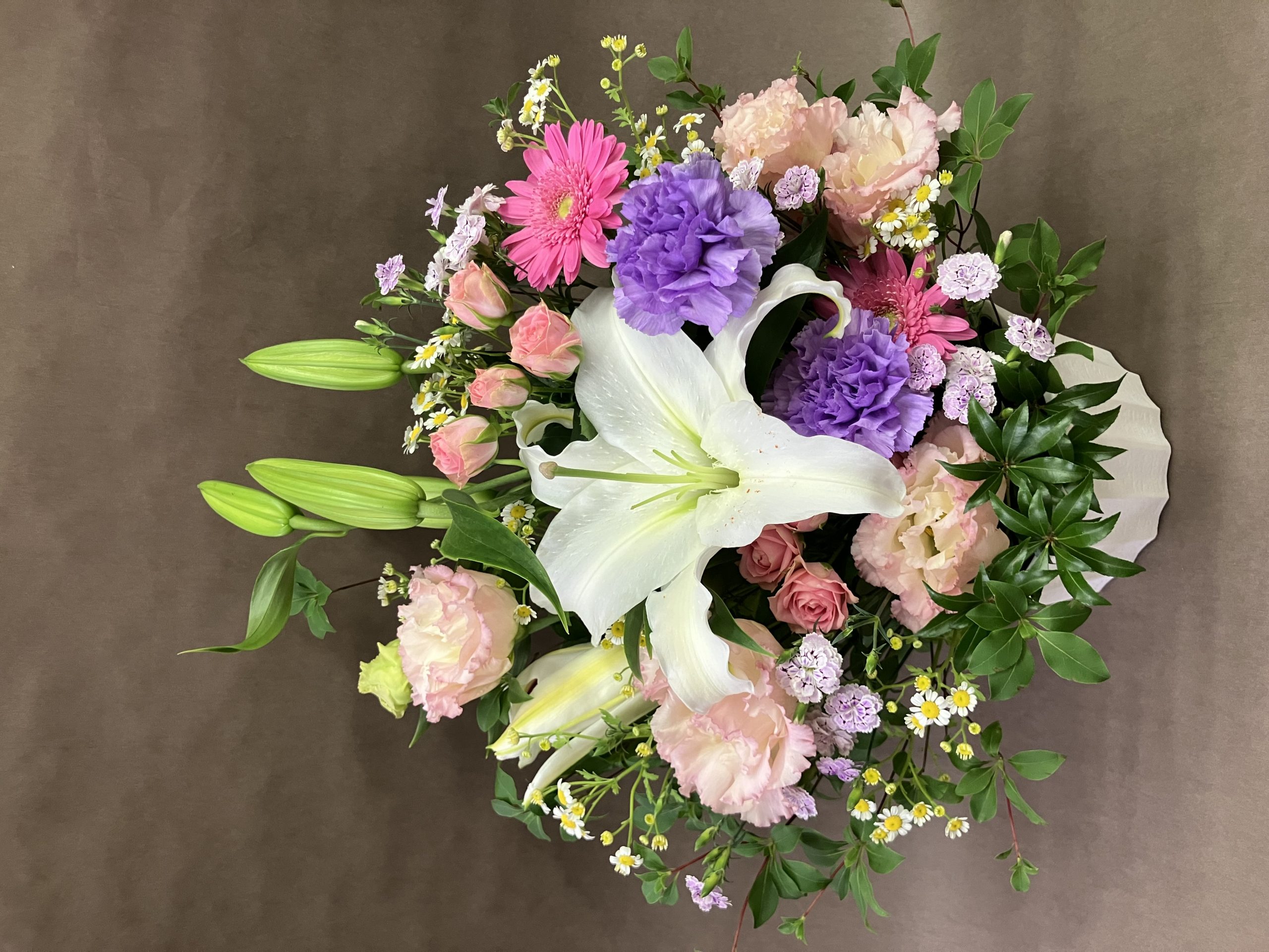 ユリ・トルコキキョウ・ミニバラ・カーネーション(サントリー・ムーンダスト)・なでしこカーネーション(ラフィーネ・ピア)・マトリカリア・ドウダンツツジ などです。