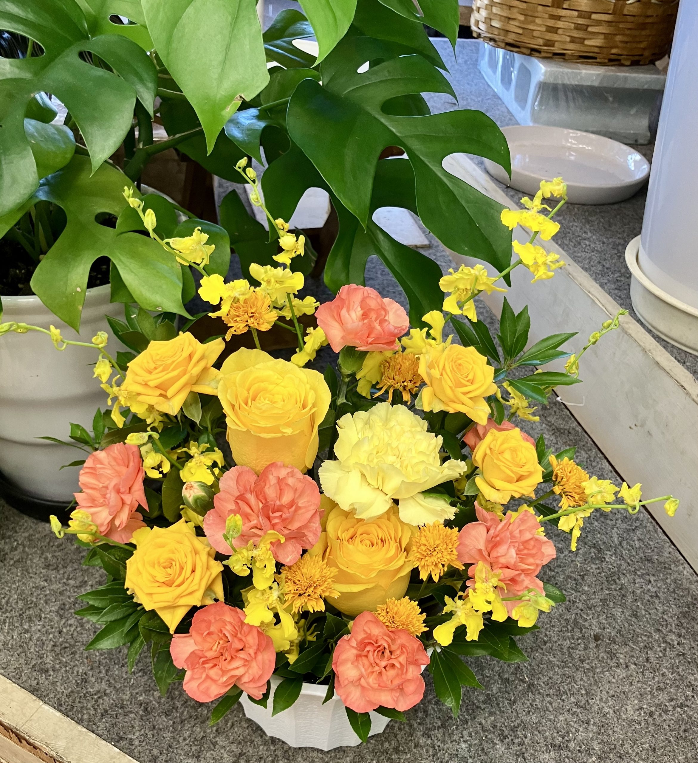 タグ: お祝い, お誕生日祝い, かわいい, アレンジメント, オレンジ色, 企業, 会社, 元気, 家族, 施設, 法人, 犬山城下町, 犬山市、花屋, 発表会, 結婚記念日, 花の香花園, 花キューピット, 開店祝, 黄色