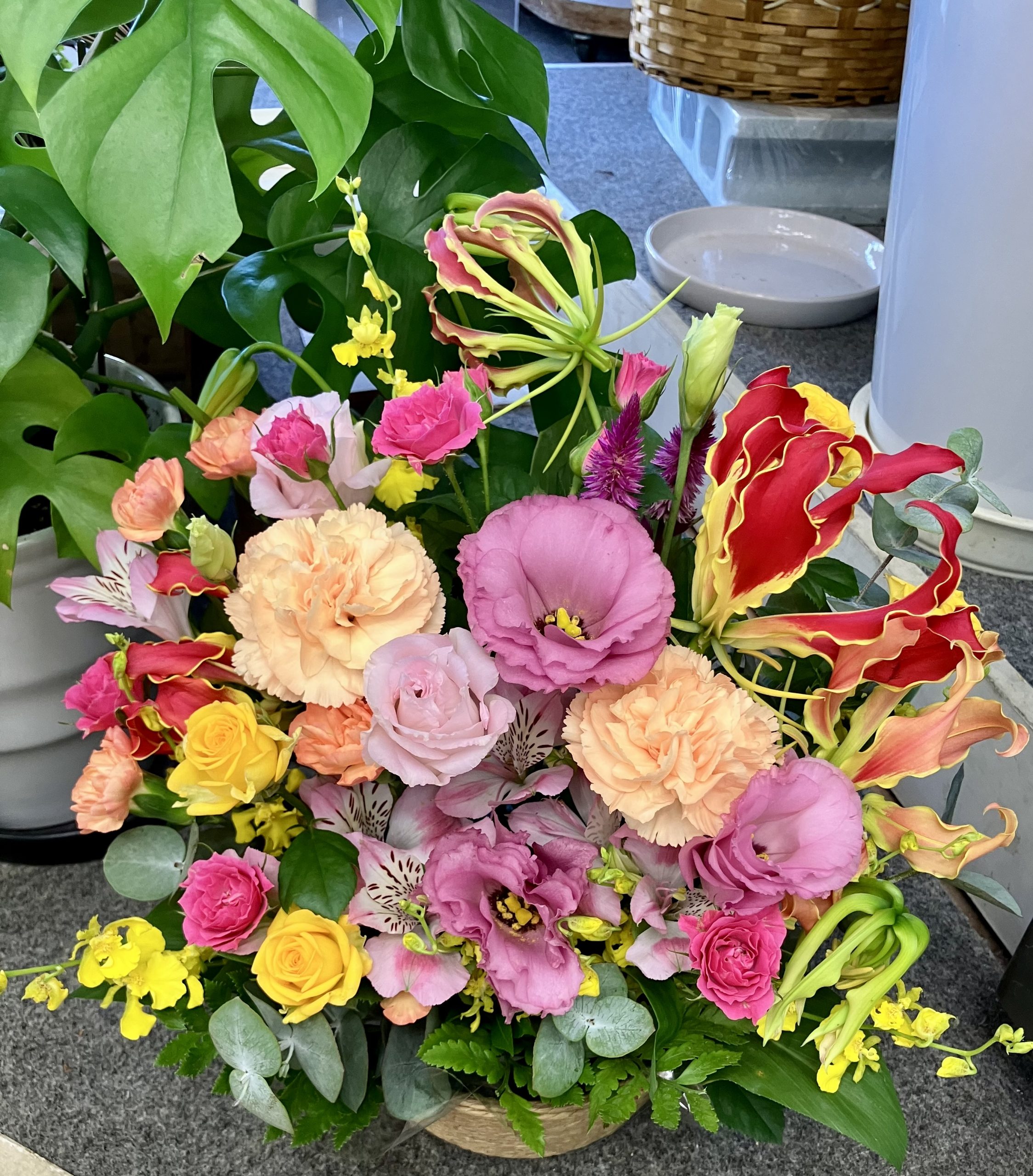 トルコキキョウ、グロリオサ、ミニバラやカーネーションなどで明るく華やかに色合いミックスにてお作りさせていただきました、アレンジメントです。ご家庭で飾られるのであまり大きすぎずコンパクト過ぎない感じでお作りさせていただきました。おめでとうございます!ご注文ありがとうございました。
