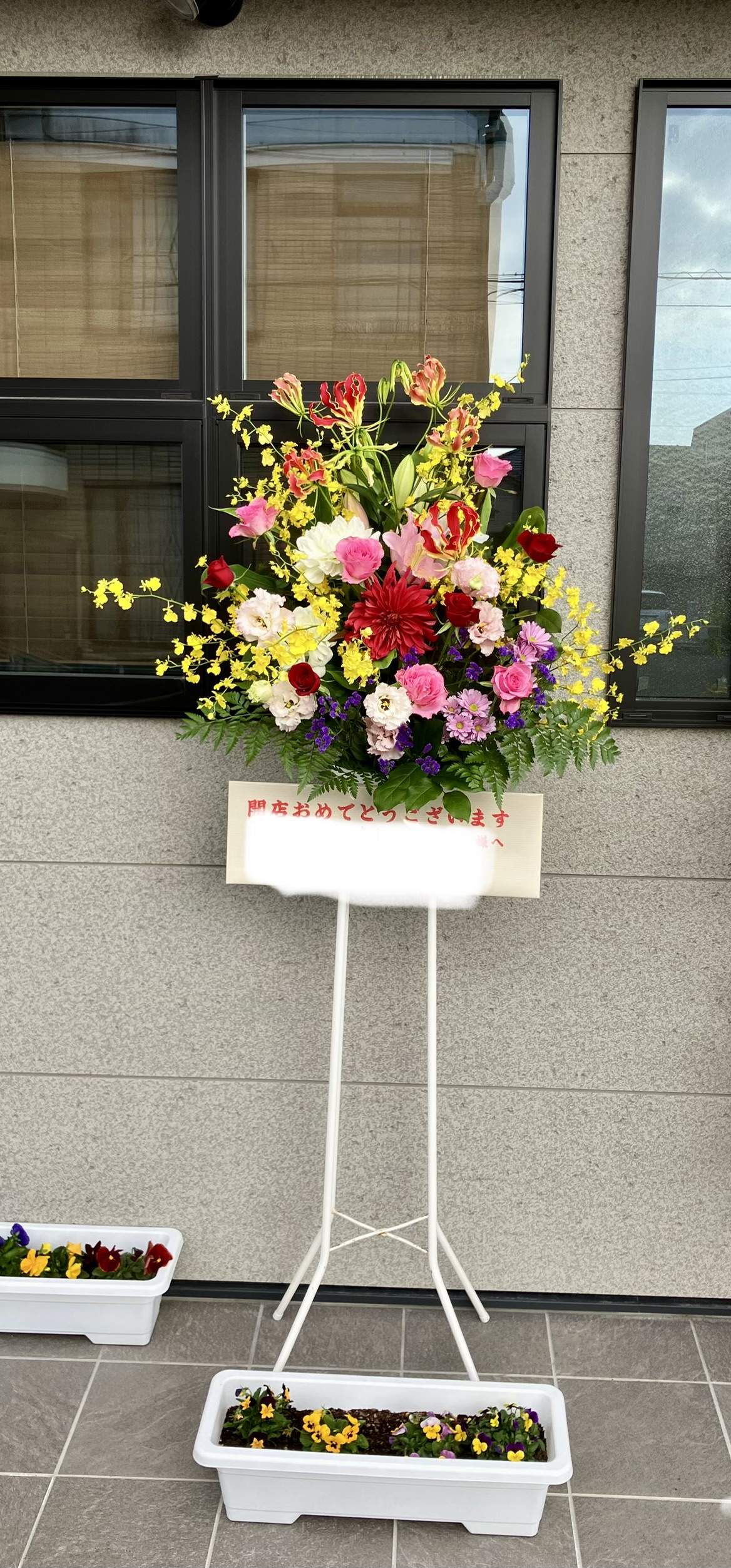 カラオケのお店が開店され、お祝いのスタンド花をお届けいたしました。色合いお任せの華やかな感じにお作りしております。ご注文ありがとうございました。おめでとうございます。