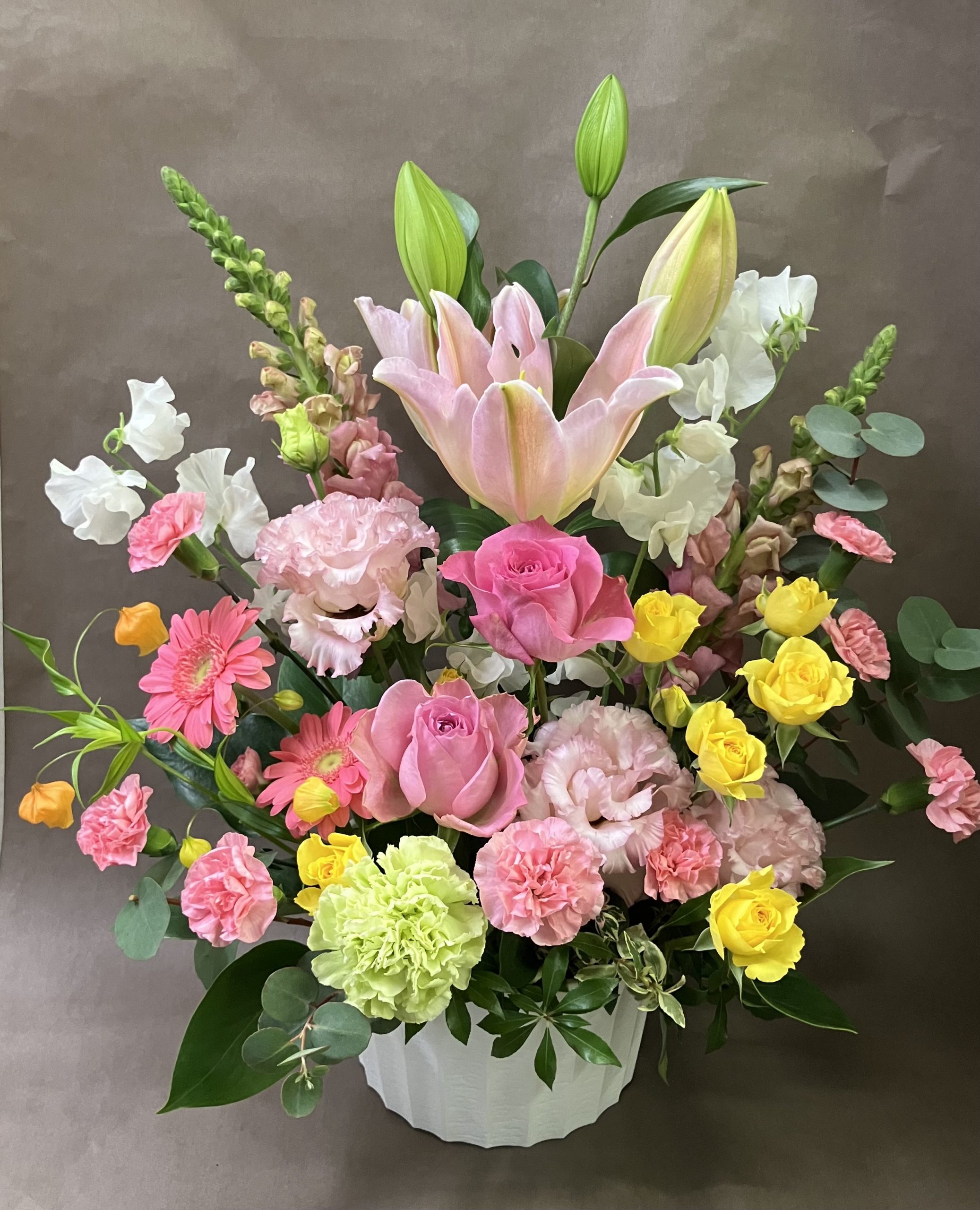 ユリ・バラ・トルコキキョウ・ガーベラ・スイートピーなどで華やかに可愛らしくお作りしてお届けいたしました。